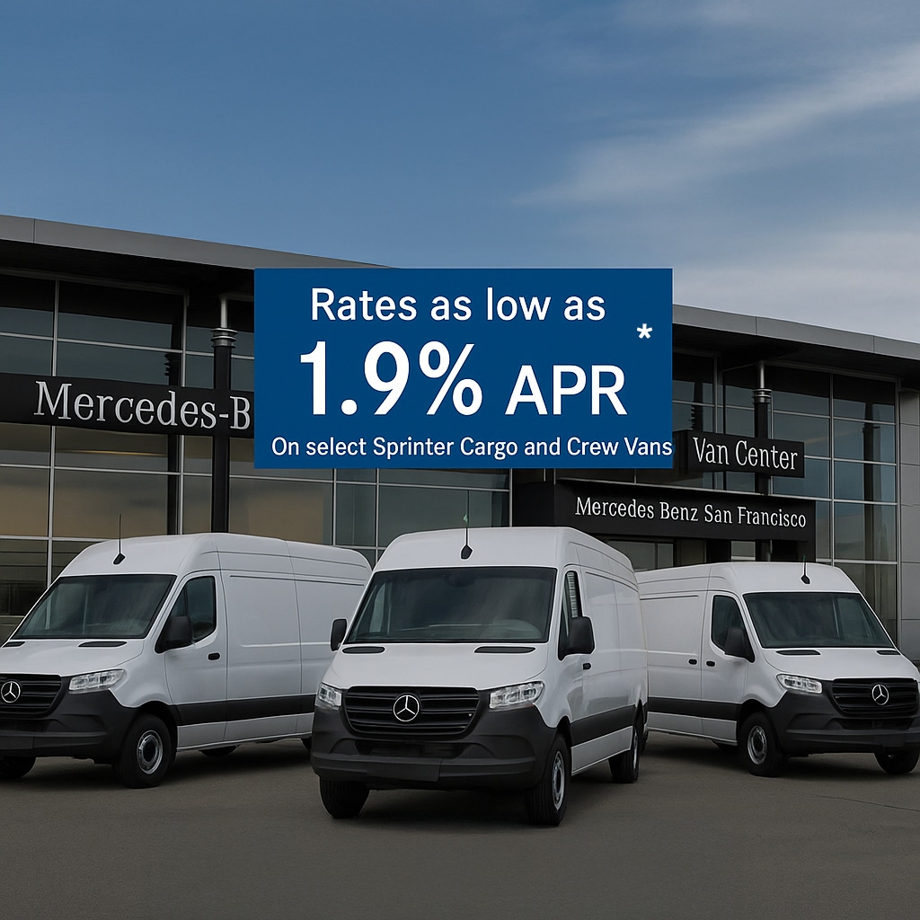 Lease/finance offer available only at Mercedes-Benz of San Francisco Van Center on select new Sprinter Cargo and Crew Vans, on approved credit through Mercedes-Benz Financial Services. Rates as low as 1.9% APR for up to 36 months; not all customers will qualify. Example: With 1.9% APR financing for 36 months, your monthly payment is $28.60 for every $1,000 financed. Down payment may be required. Dealer contribution may vary and could affect your actual payment. Offer not available on leases and may not be combined with other special rates, discounts, or incentives. Vehicle availability is limited; offer valid only on in-stock units. Any potential tax advantages depend on your individual tax situation; consult your tax advisor-dealer does not provide tax or legal advice. Excludes title, taxes, registration, license fees, insurance, and $[dealer doc fee] dealer document processing charge. Offer valid through 12/31/25. See Mercedes-Benz of San Francisco Van Center for complete details.
